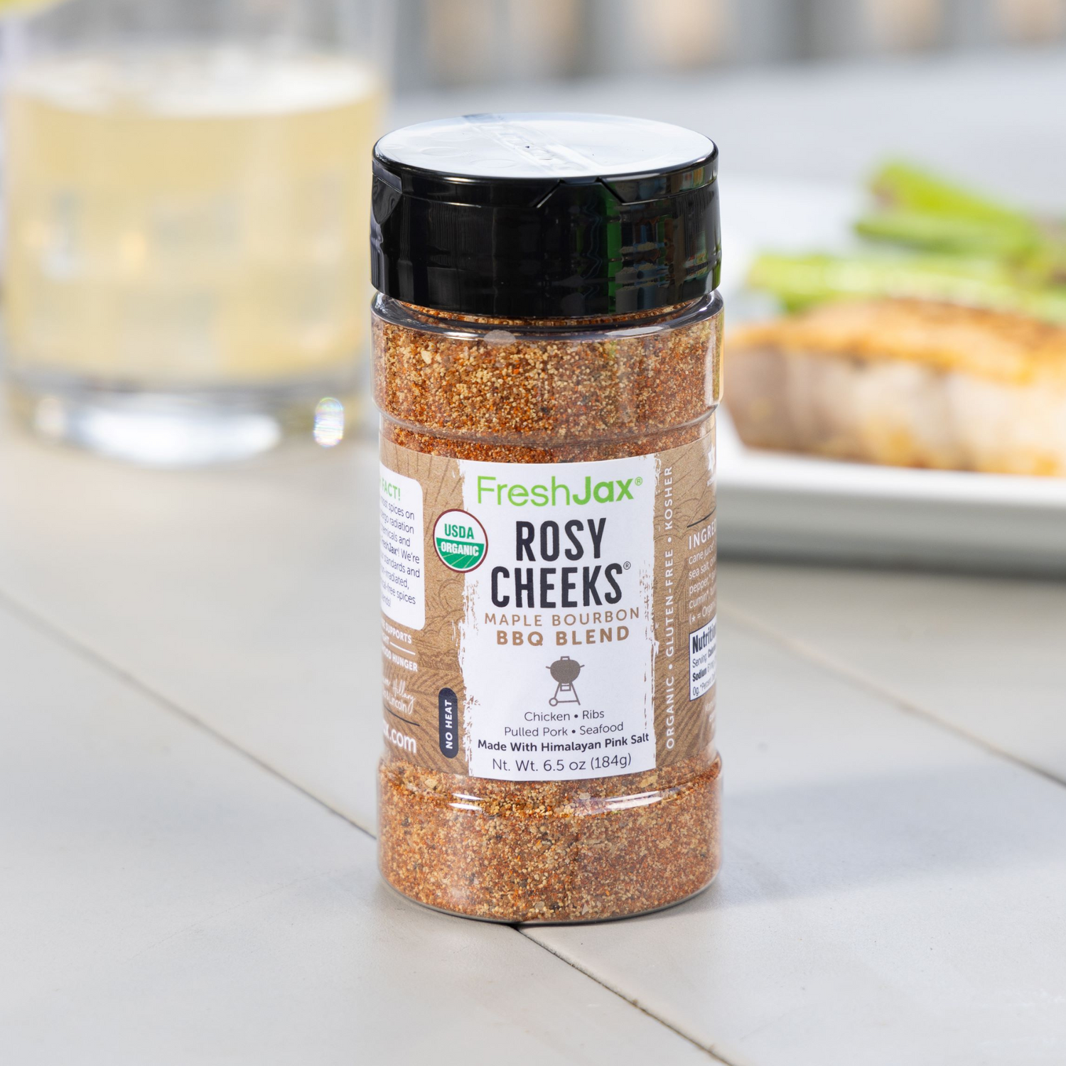 FreshJax Rosy Cheeks Maple Bourbon BBQ Blend is a savory BBQ rub blending organic maple syrup, Kentucky bourbon flavor, smoked spices, and herbs to enhance meats, poultry, seafood, and veggies.