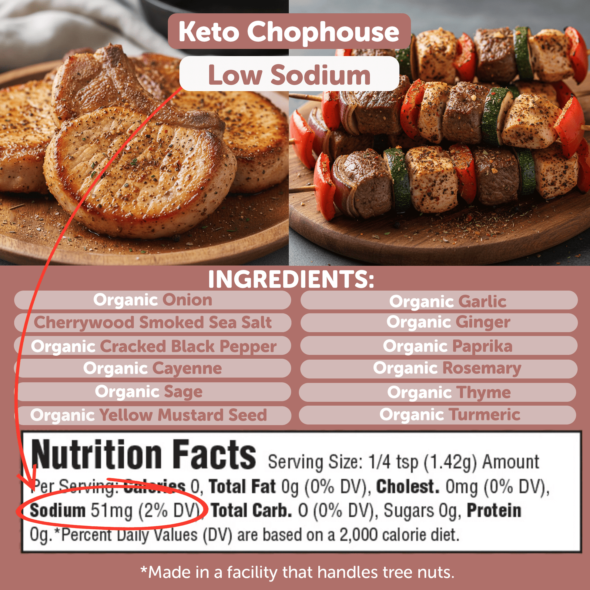 Ingredients: Organic garlic, organic onion, cherrywood smoked sea salt, organic cracked black pepper, organic paprika, organic cayenne, organic rosemary, organic thyme, organic sage, organic ginger, organic turmeric, organic yellow mustard seed. (made in a facility that handles tree nuts)