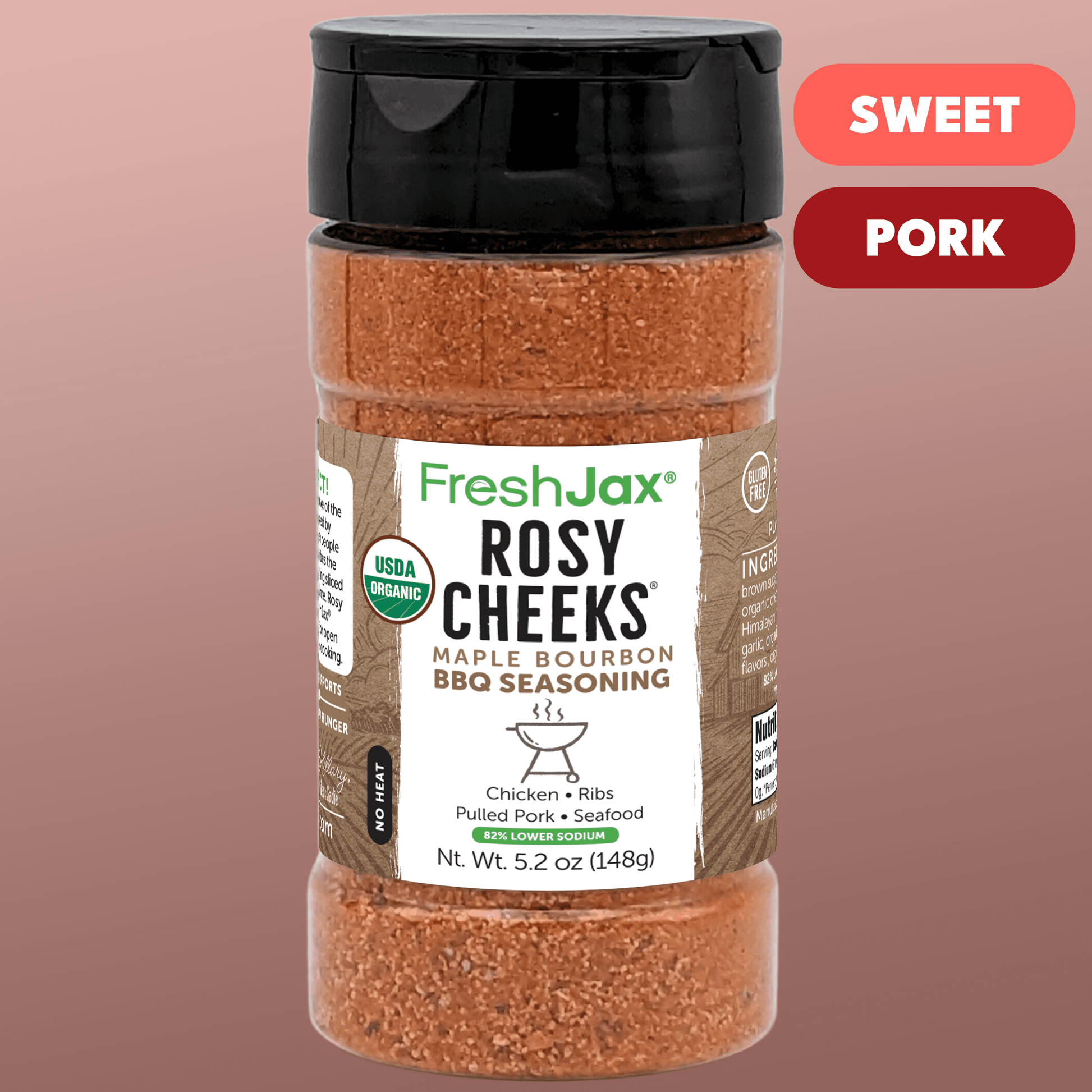 FreshJax Rosy Cheeks Maple Bourbon BBQ Blend is a savory BBQ rub blending organic maple syrup, Kentucky bourbon flavor, smoked spices, and herbs to enhance meats, poultry, seafood, and veggies.