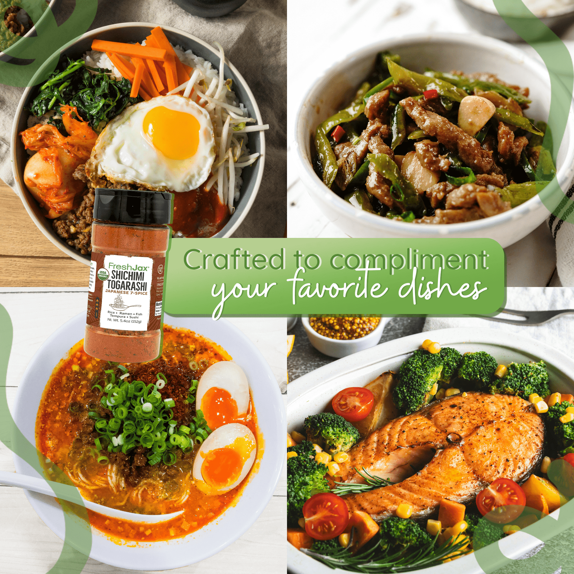 Experience the bold, aromatic heat of Japan’s favorite table spice—FreshJax® Shichimi Togarashi. This organic 7-spice blend features crushed chili pepper, toasted sesame seeds, sea salt, orange peel, ginger, and other savory spices that create the perfect balance of heat, citrus, and umami.