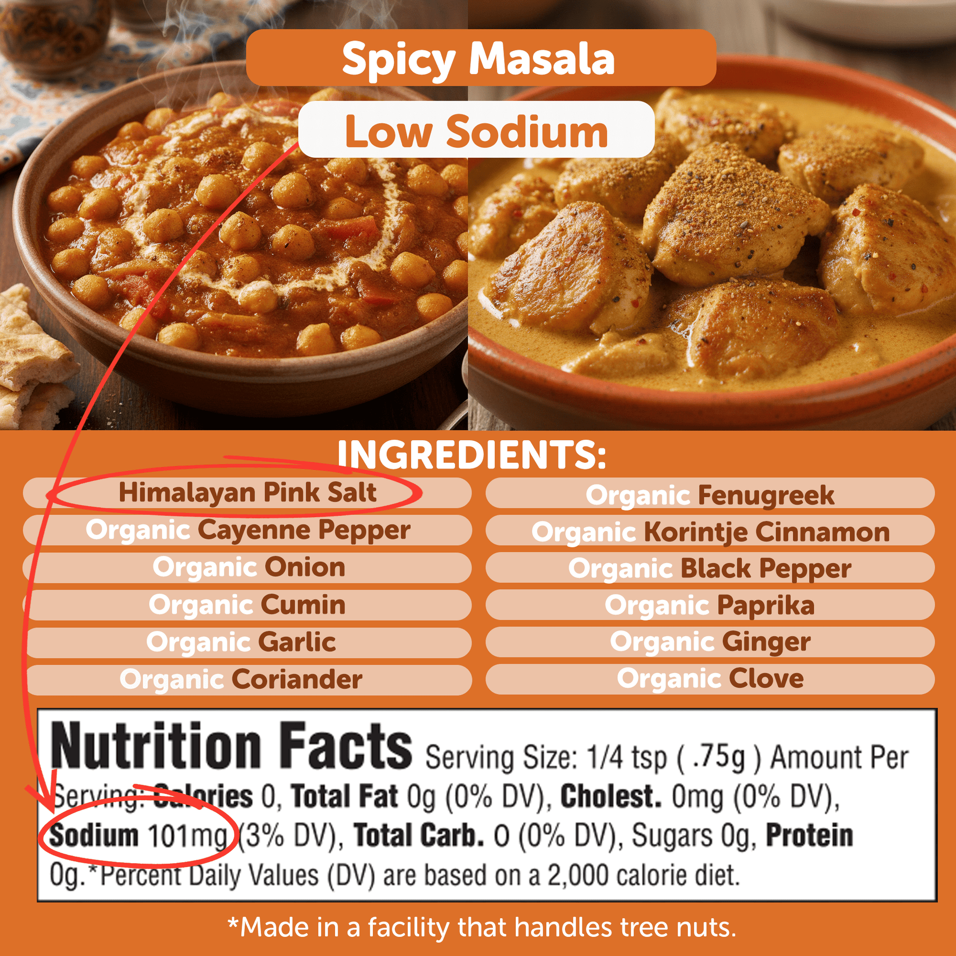 Ingredients: Himalayan Pink Salt, organic cayenne pepper, organic onion, organic cumin, organic garlic, organic coriander, organic fenugreek, organic korintje cinnamon, organic black pepper, organic paprika, organic ginger, organic clove (made in a facility that handles tree nuts)