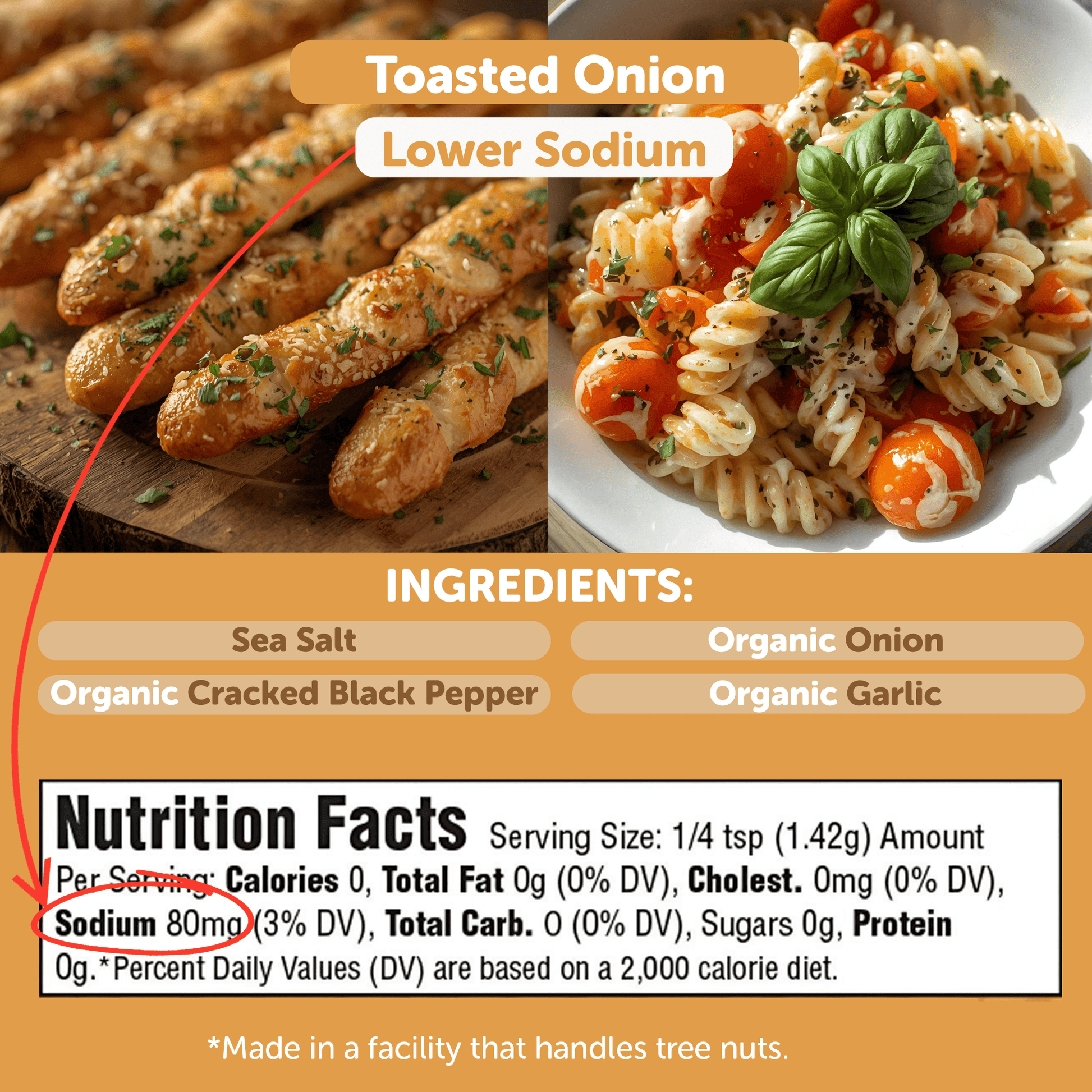 It’s an all-purpose seasoning made from organic toasted onion, organic garlic, sea salt, and cracked black pepper, designed to add rich, savory flavor to any dish.