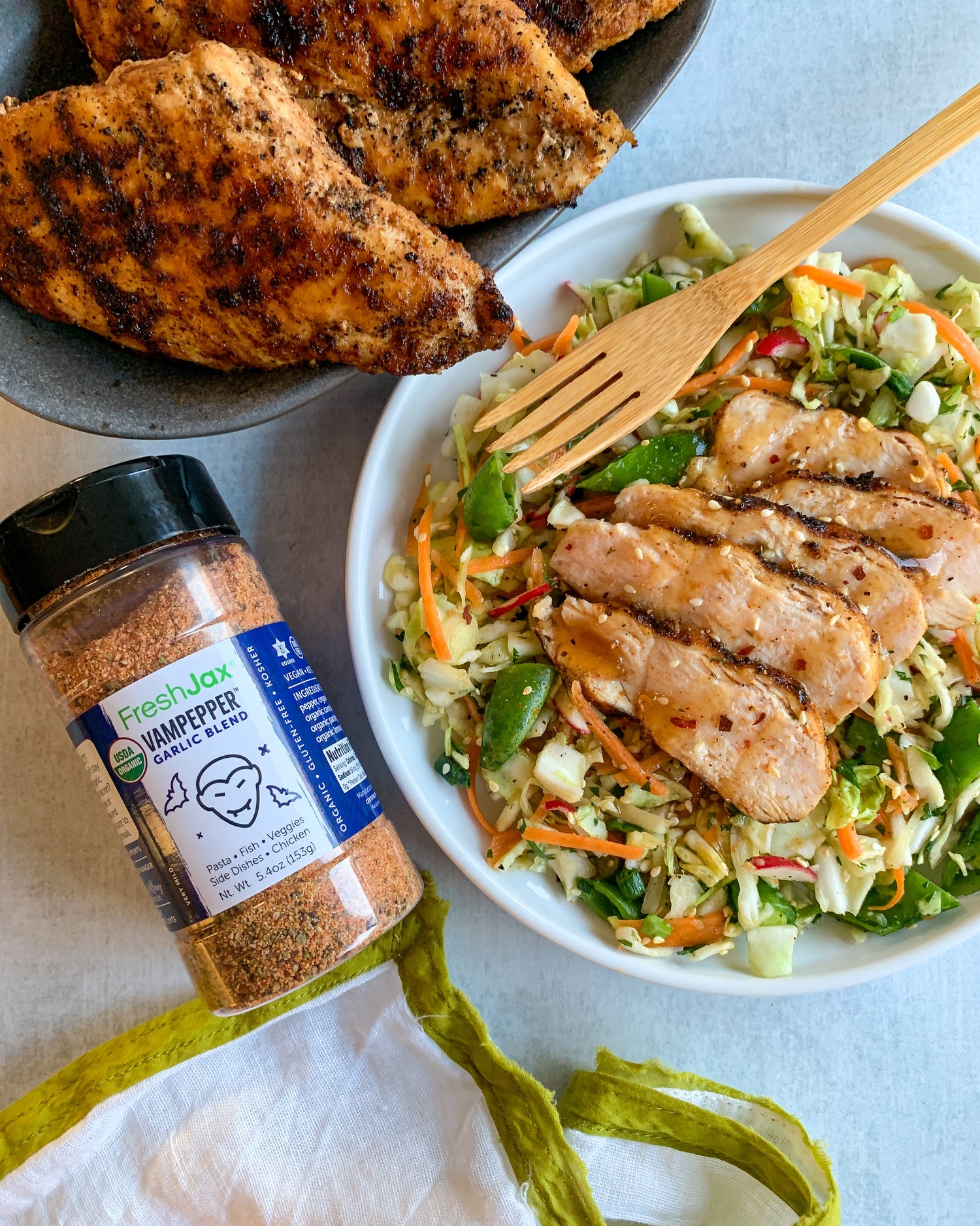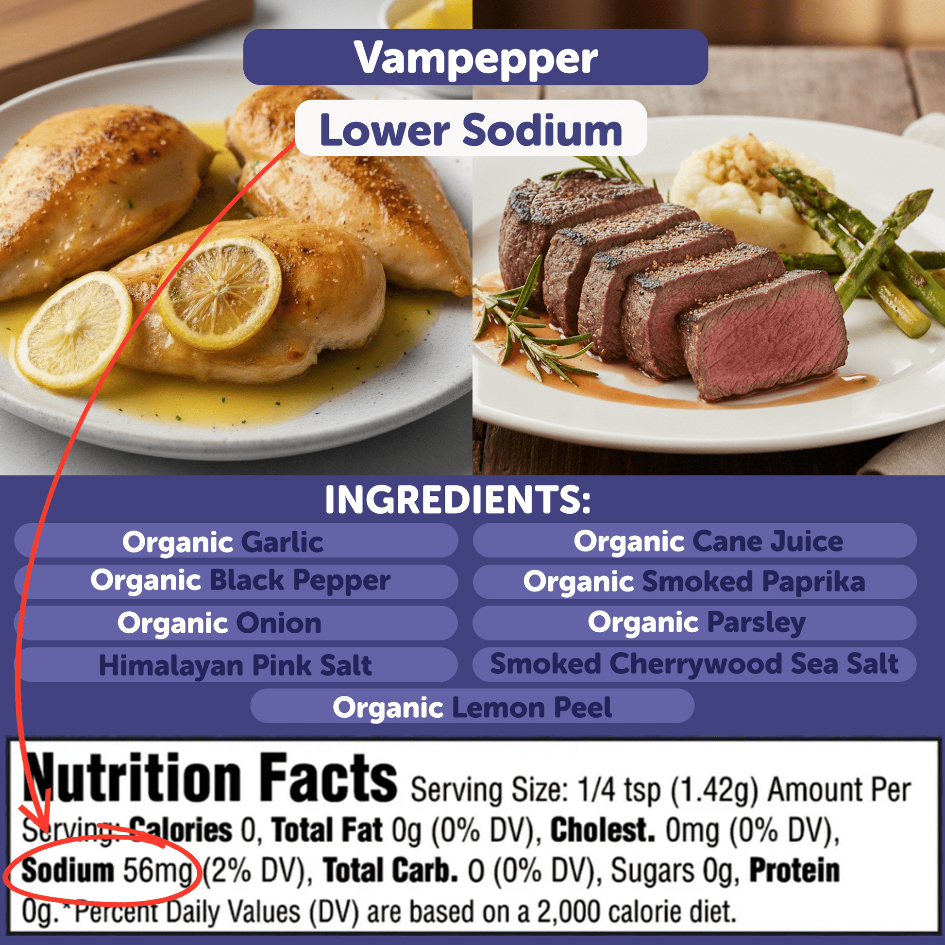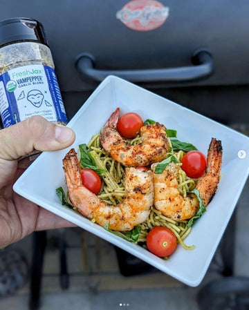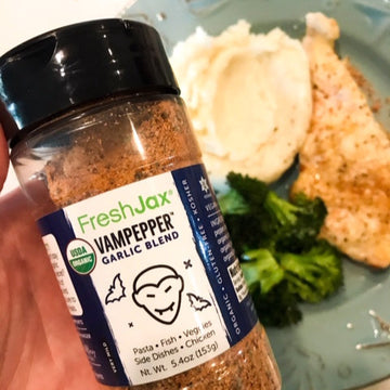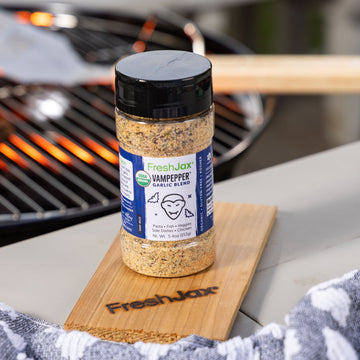 FreshJax VamPepper® is a bold seasoning made with garlic, cracked black pepper, and cherrywood smoked sea salt, crafted to bring smoky, savory flavor to any dish.